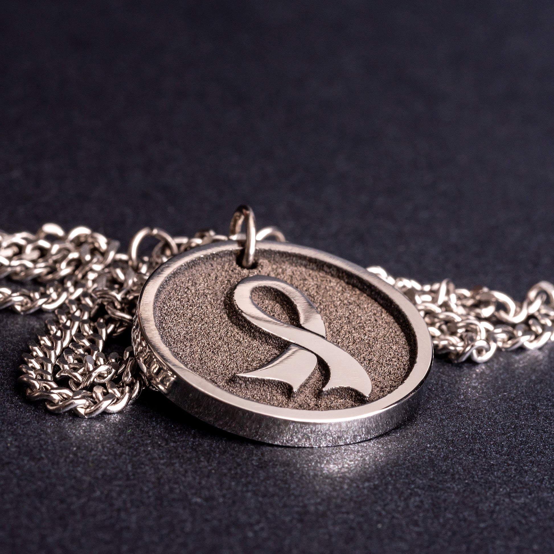 Crafted with care and attention to detail, this pendant is made of jewelry stainless steel and designed to last for years to come. The ribbon is intricately engraved onto the surface of the pendant, creating a striking and elegant design. The pendant also comes with a durable chain, so you can wear it comfortably and securely around your neck.