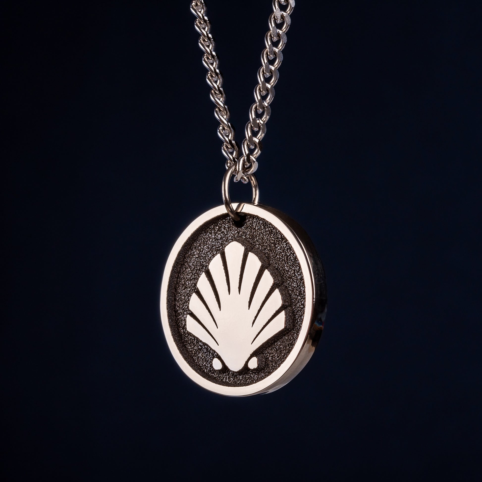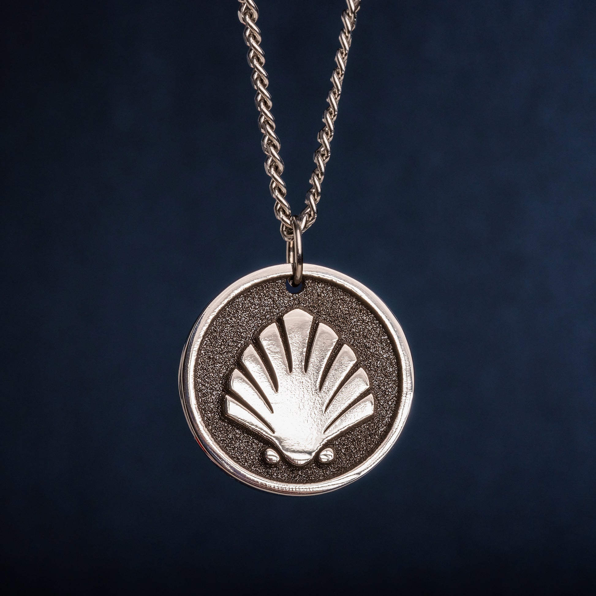 A Camino de Santiago necklace featuring a sea scallop shell, a beautiful and meaningful piece of jewelry that celebrates the rich history and spiritual significance of the famous pilgrimage route.