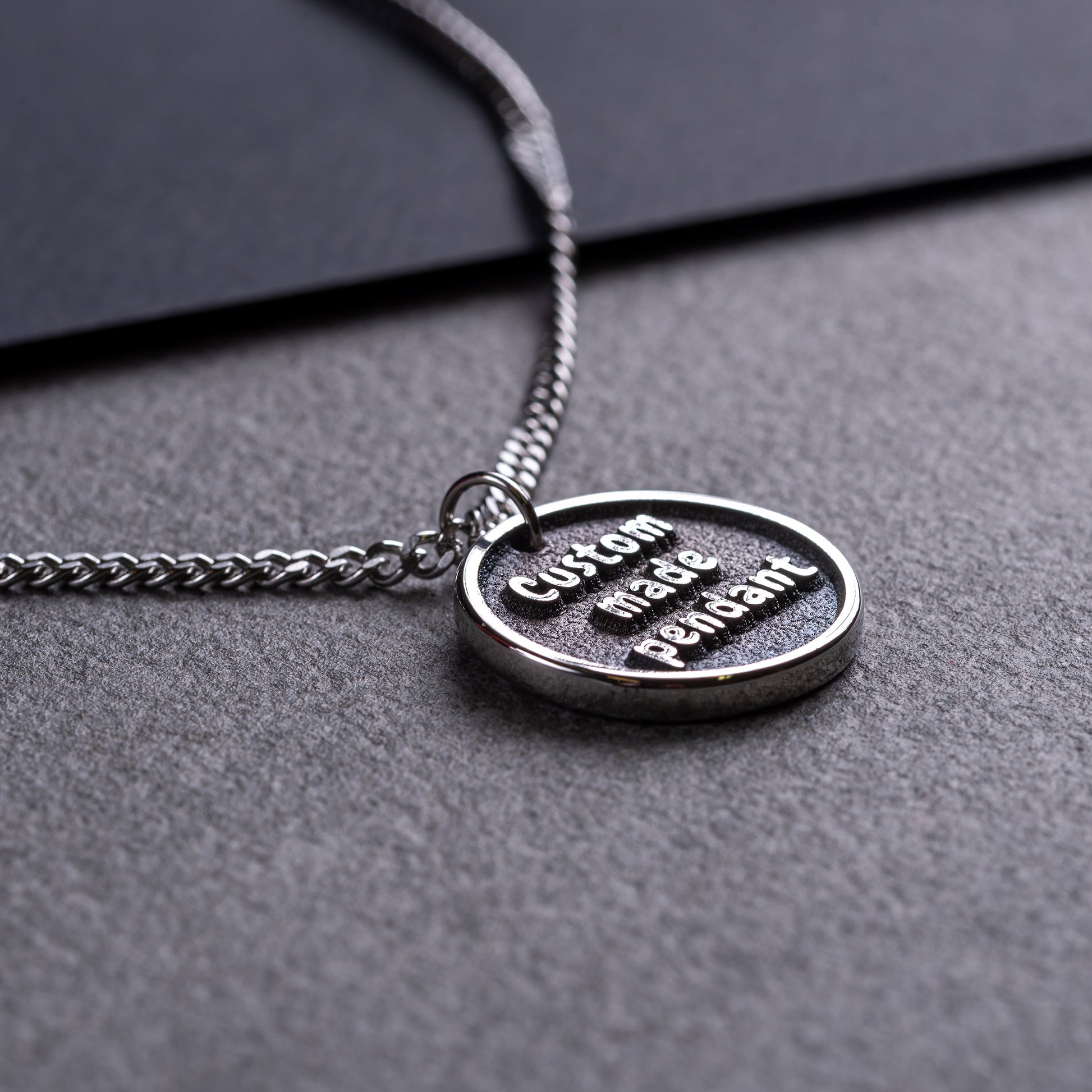 The pendant is made of 3 mm stainless steel and 1 inch (25.4 mm) in diameter by removing material around the letters, creating a 3-D relief and then hand polishing the exterior of the piece to a mirror finish.