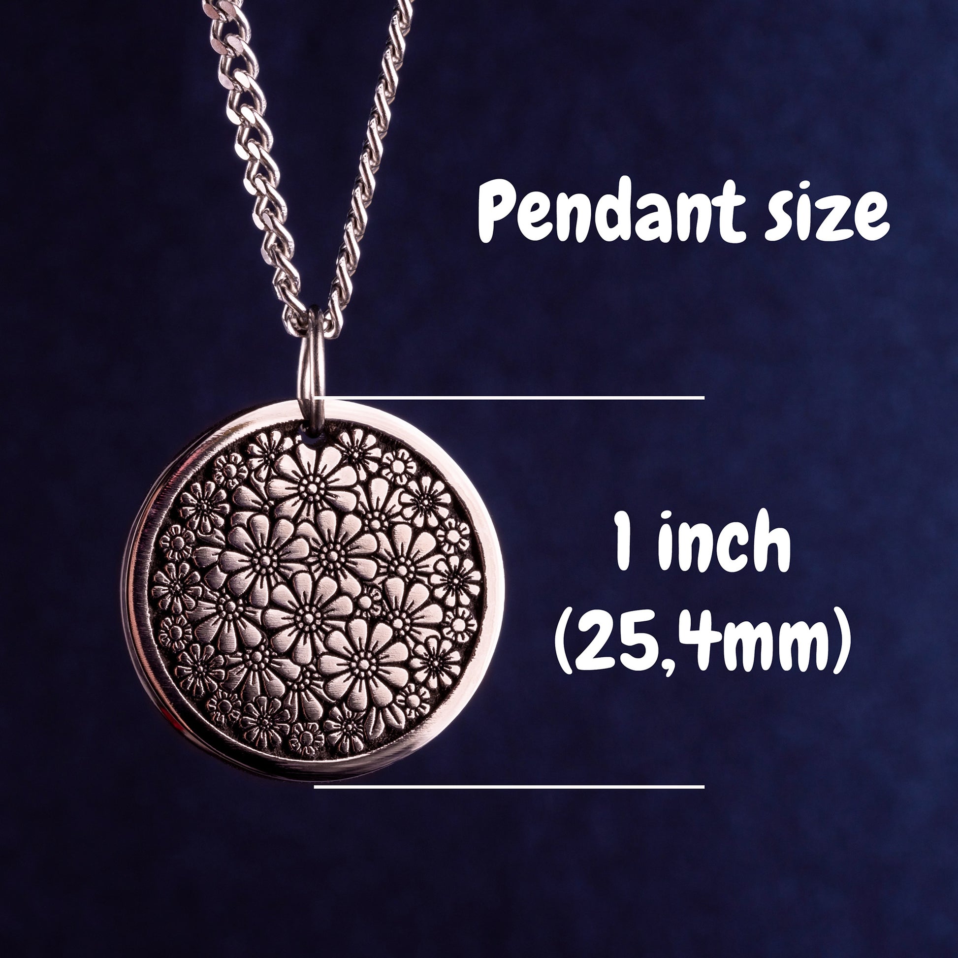Crafted with high-quality jewelry stainless steel, this pendant is not only stylish, but also durable. The personalized round pendant is a women's necklace that makes a perfect gift for mom, wife, or girlfriend, whether for Valentine's Day, her birthday, or any other special occasion. A pendant with Daisies is also suitable for girls who can't imagine their life without nature, sun and travel.