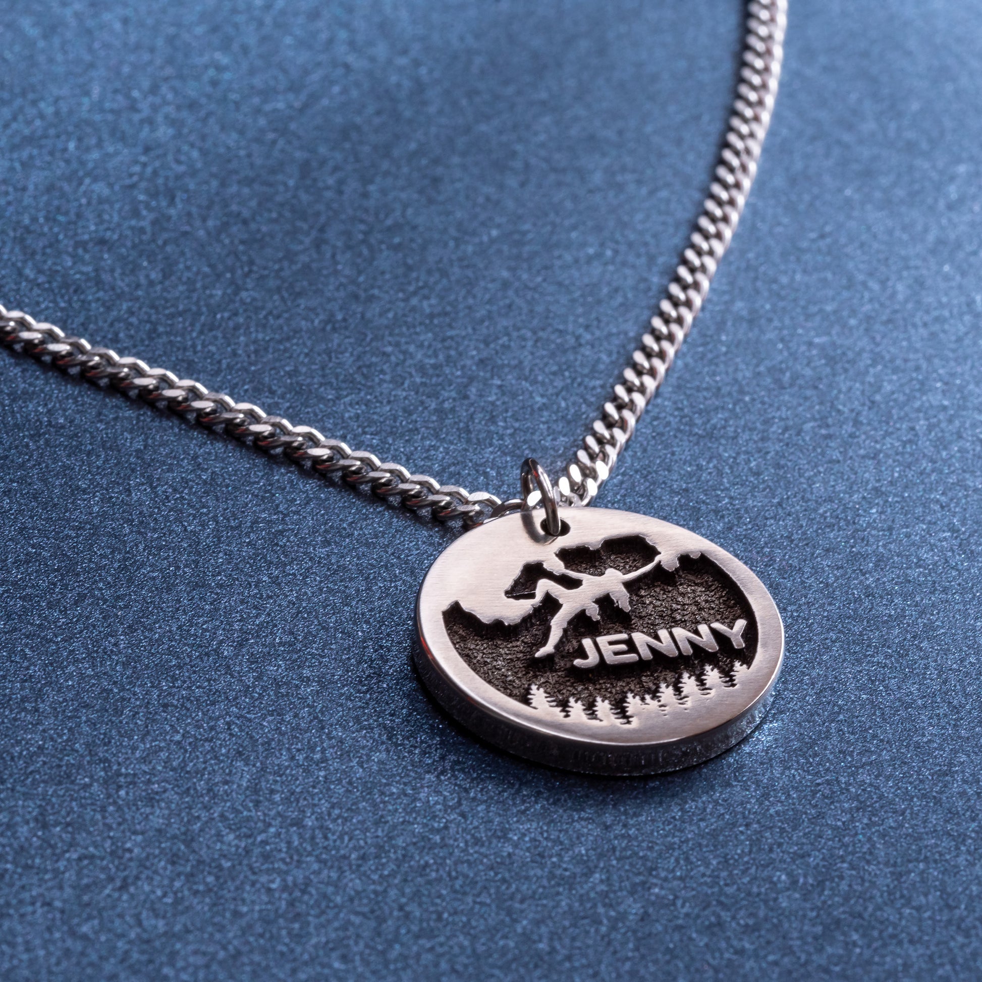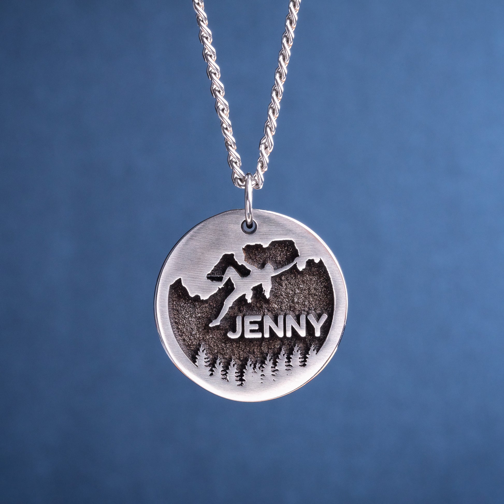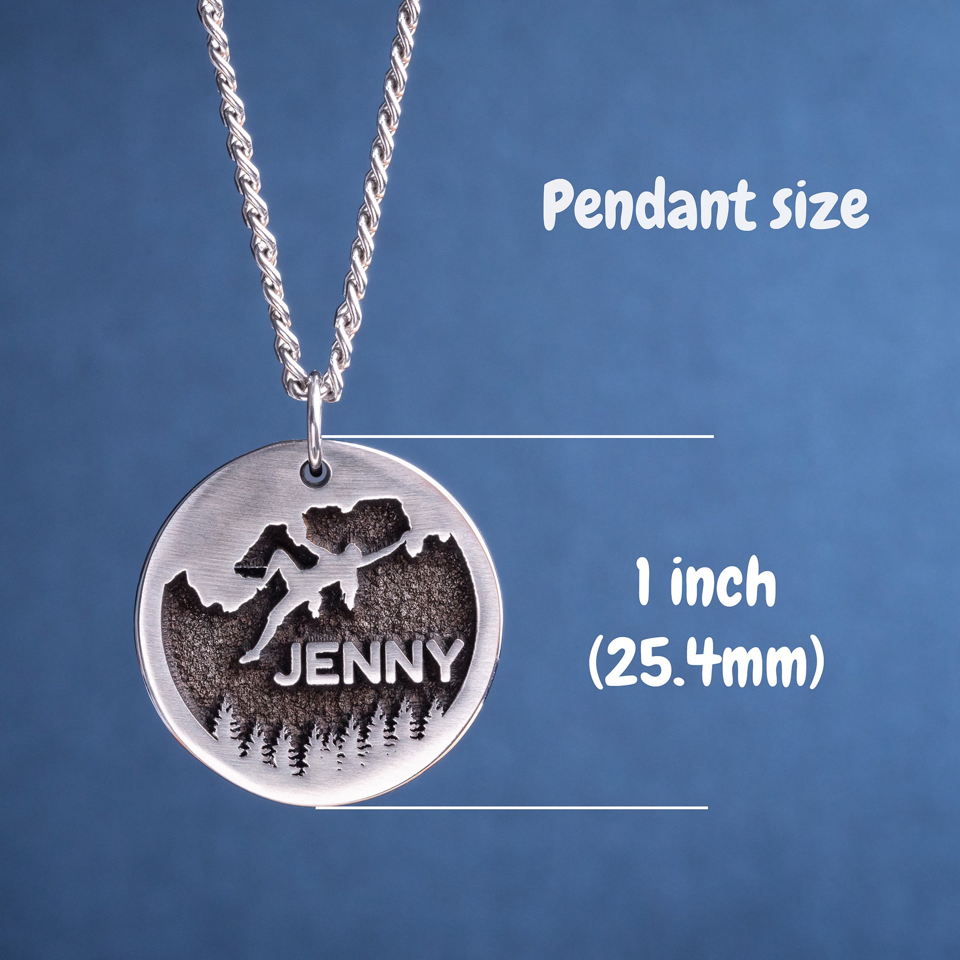 In the front side of the pendant can be engraved name or word in up to 9-10 characters. Also, a climber will be engraved, as pictured