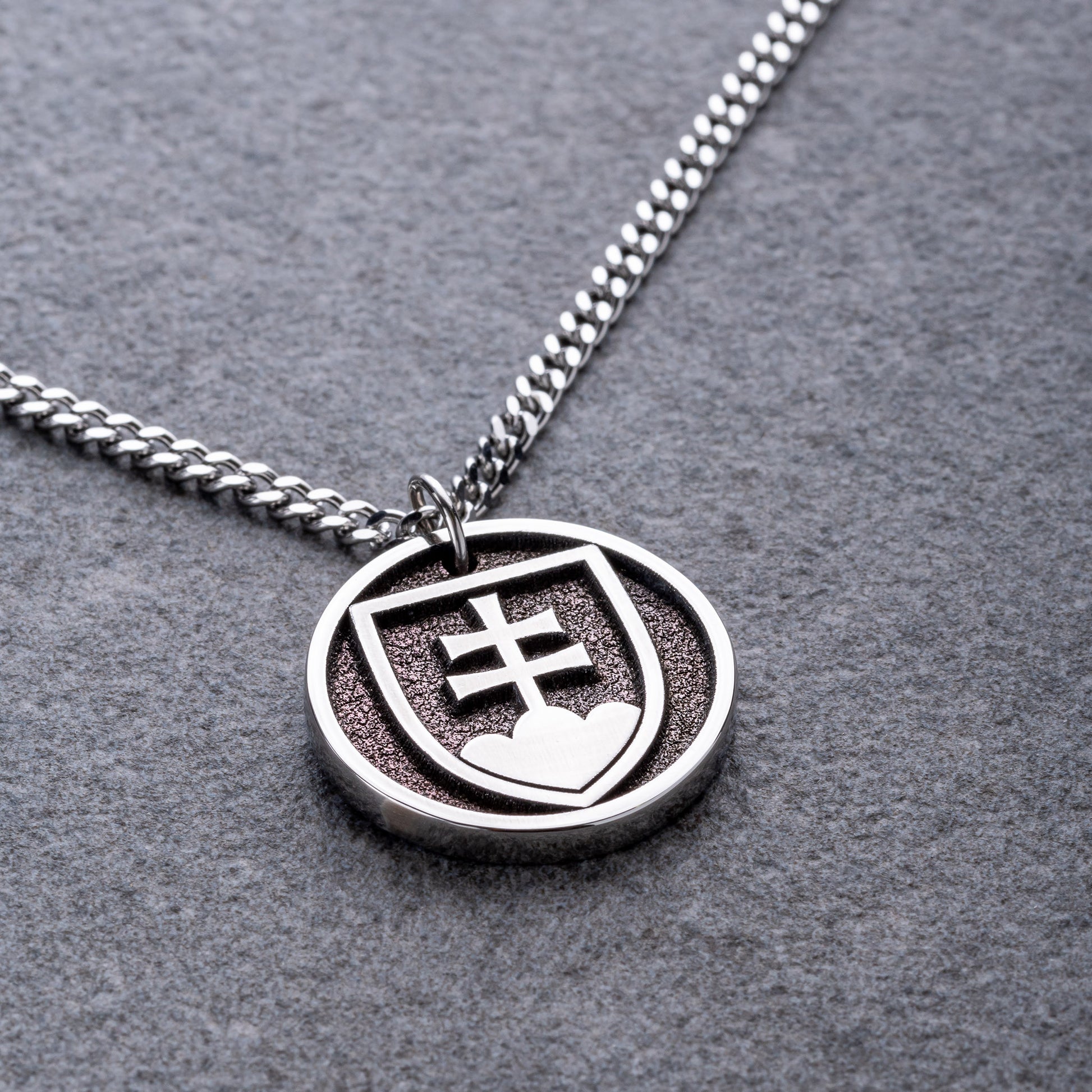 A pendant with the National Coat of Arms of Slovakia (Slovak: Štátny znak Slovenskej Republiky) - a shield with a double cross standing on three mountains - a talisman that can be a great gift for those who are now far from home, but love their homeland - Slovakia (Slovensko) with all their heart. It's a piece of Slovakia - always with you, the anchor, the rock that will remind you of your childhood, the unforgettable beauty of nature, loved ones, and relatives.