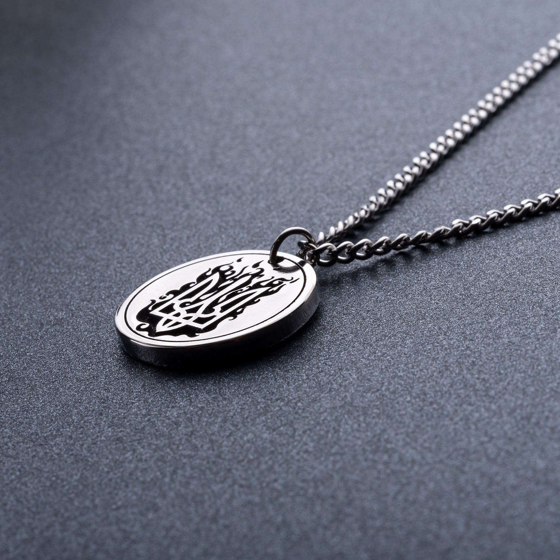 The pendant is made of stainless steel 3mm thick and 1 inch (25.4mm) in diameter by removing material around the letters, creating a 3-D relief and then hand polishing the outside of the piece to a mirror finish.